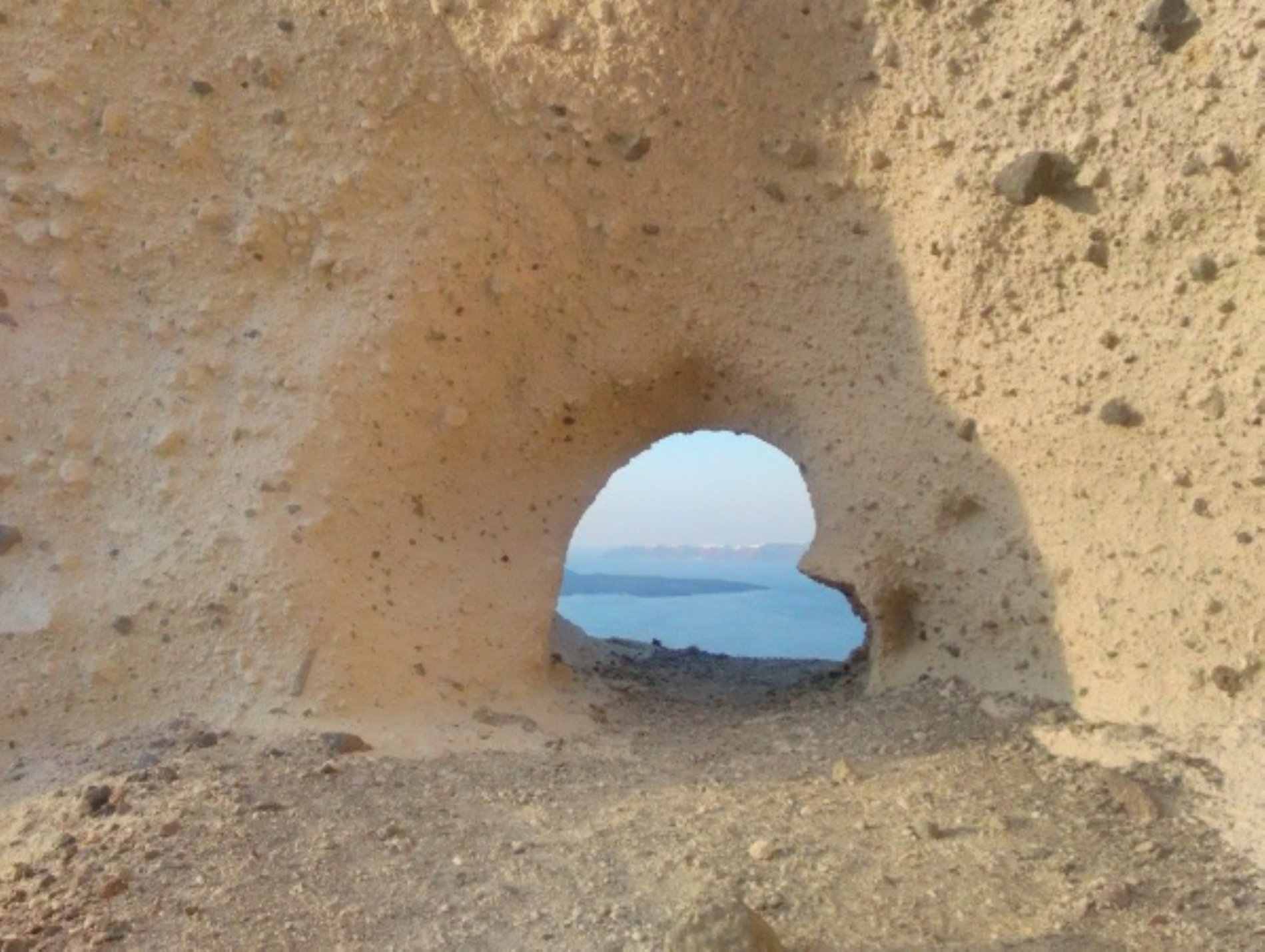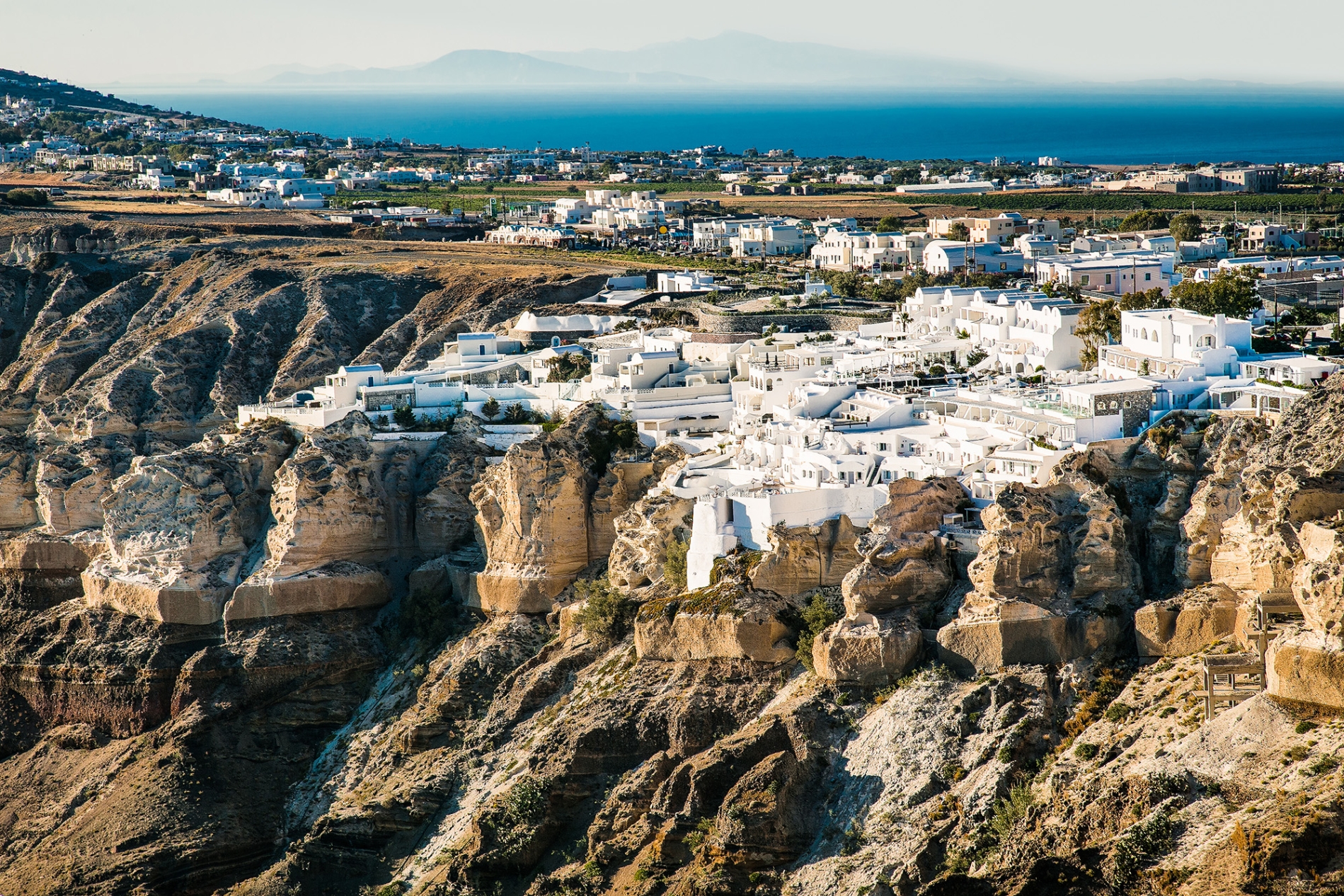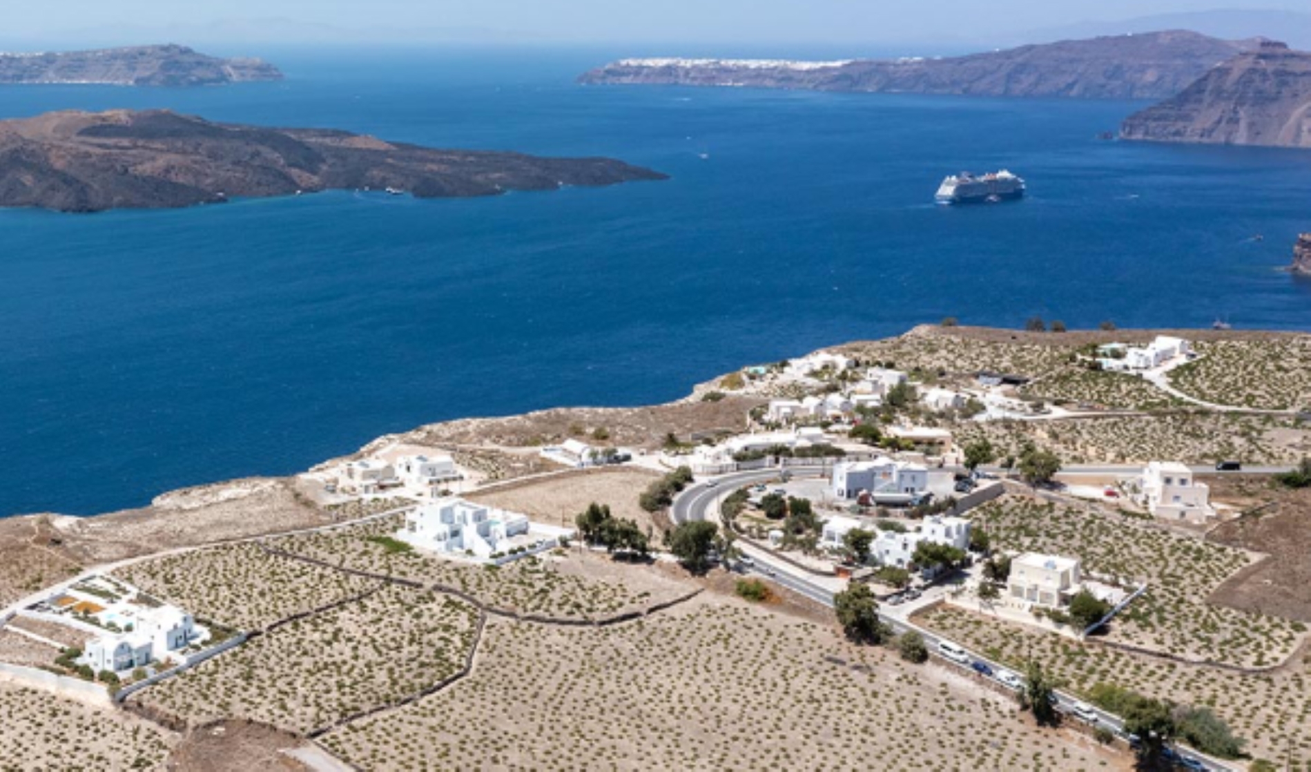 Perched on the cliff of the hill overlooking the Aegean Sea, and the Volcano the property is located in Caldera -Megalochori.